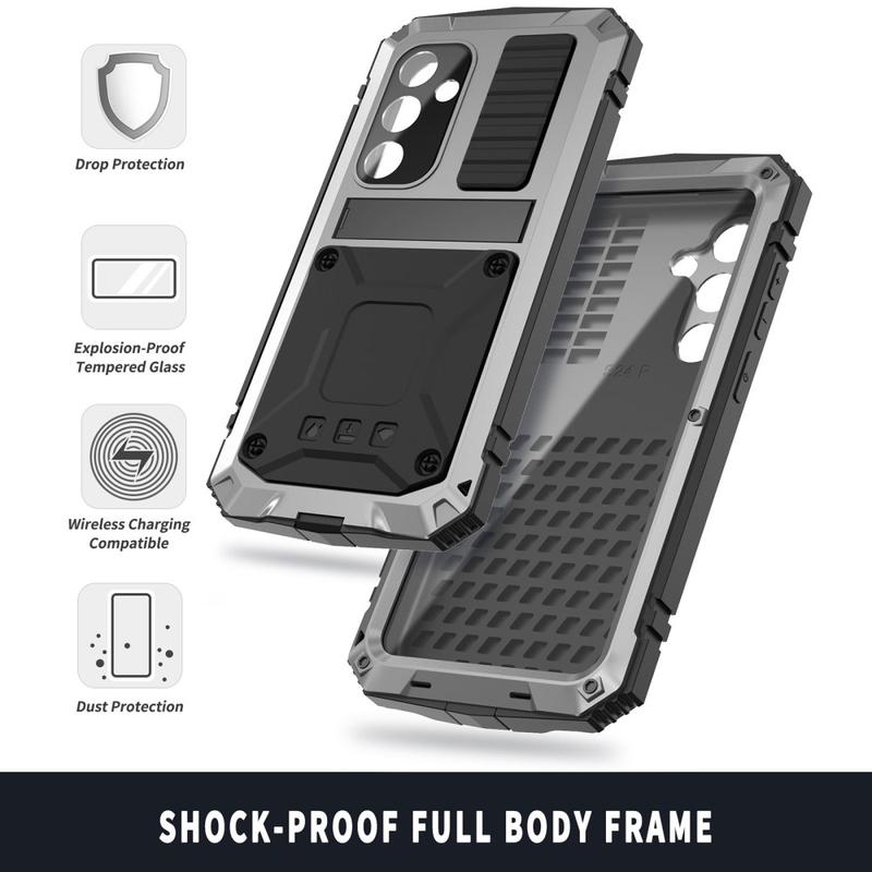 Experience unmatched protection and functionality with the R-Just Case for Samsung Galaxy S25. Built for durability, this hybrid case combines PC, silicone, and metal materials for comprehensive defense against everyday wear and tear. With its integrated kickstand and included tempered glass film, this case offers premium practicality without compromising style. Designed for the modern user, it’s the ideal accessory to protect your device while maintaining sleek aesthetics.