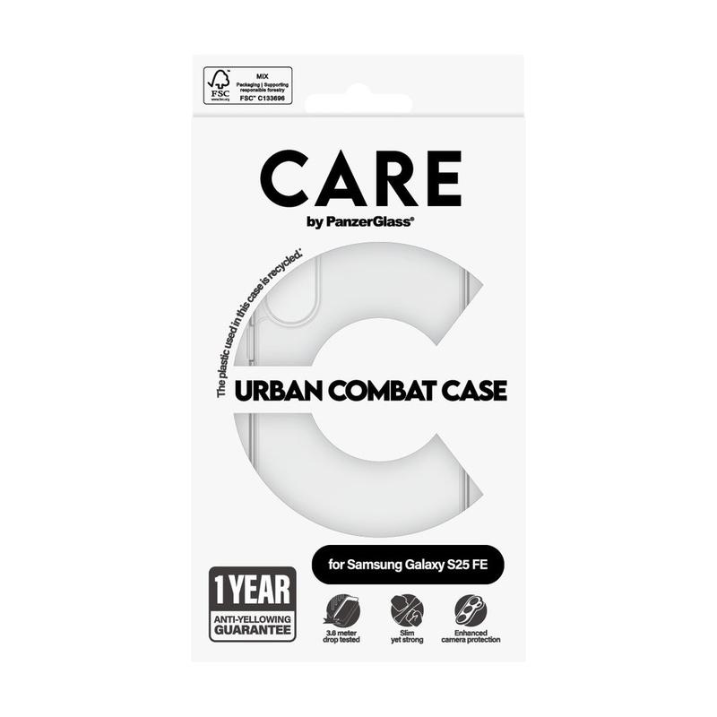The CARE by PanzerGlass Flagship Case for Samsung Galaxy S25 FE Urban Combat with Clear Frame is designed for those who need robust protection without sacrificing style. Made from 100% recycled plastic, this case is built to withstand drops up to 4.8 meters and offers enhanced scratch and shock resistance. It is also compatible with wireless charging and comes with a 1-year anti-yellowing guarantee.