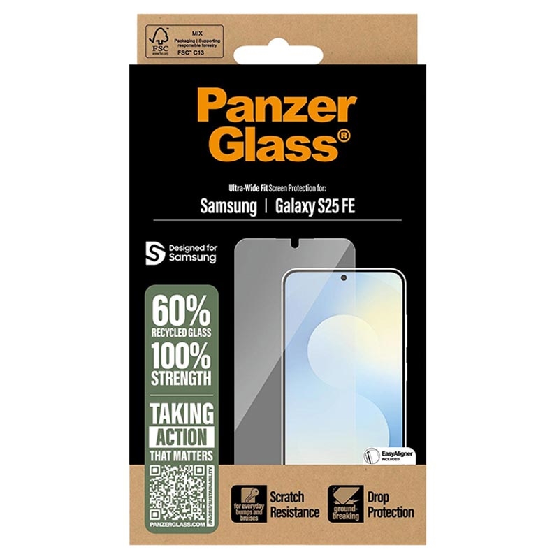 The PanzerGlass Ultra-Wide Fit screen protector with EasyAligner is the ultimate defense for your Samsung Galaxy S25 FE against everyday damage. Don't let accidental bumps or crushing falls ruin your device. With this scratch and shock-resistant screen protector, you can enjoy high-level drop protection and keep your phone looking pristine. Also, thanks to the included EasyAligner tool, the installation has never been easier.