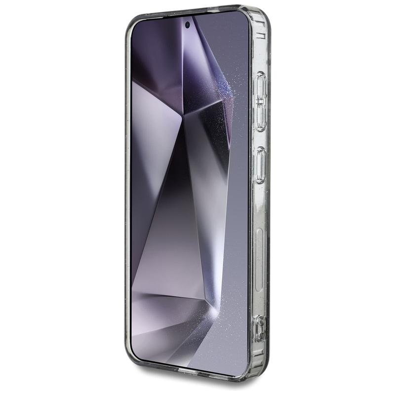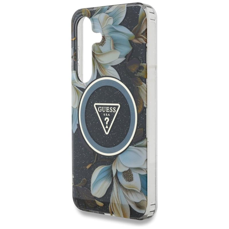 Protect your Samsung Galaxy S25 in style with the Guess Glitter Flowers Triangle Buttons MagSafe Case, combining modern design, durability, and wireless charging convenience.