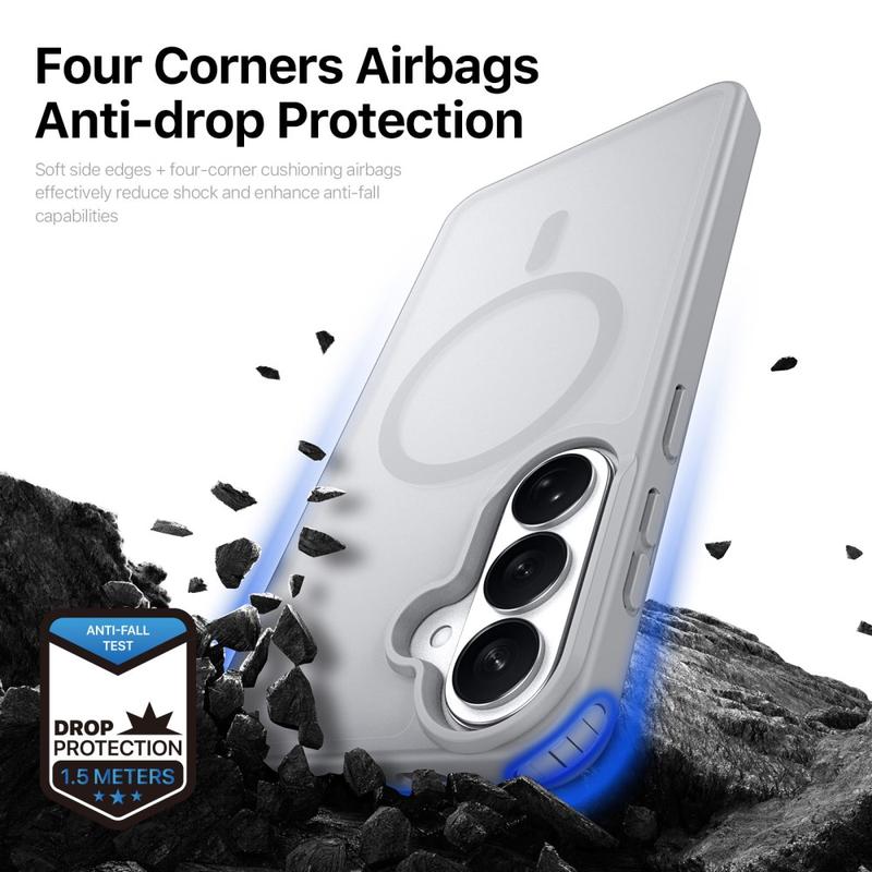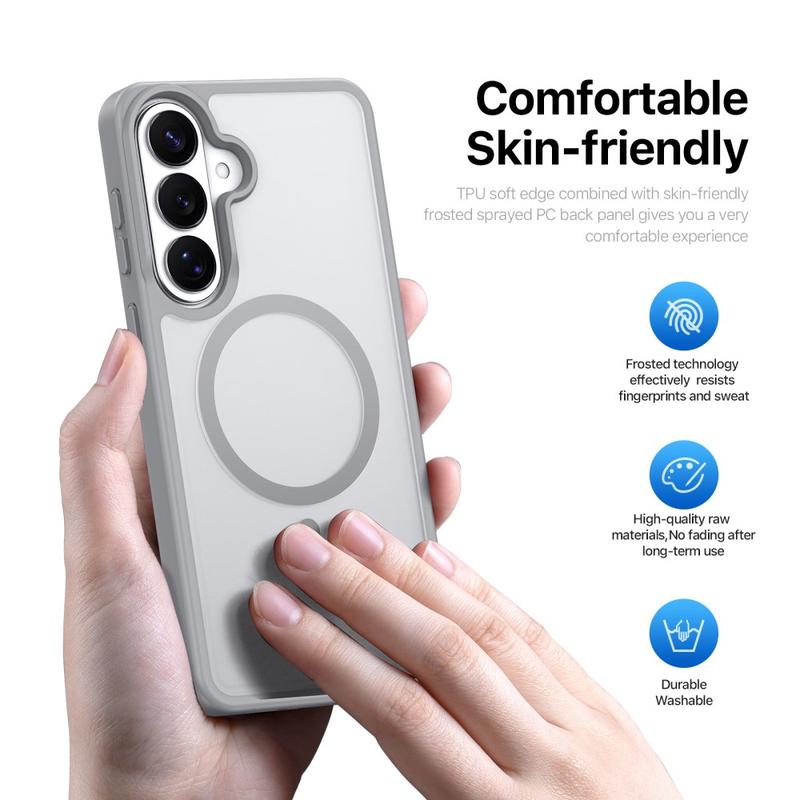 Protect your Samsung Galaxy S26+ with a sleek matte cover that clicks straight onto MagSafe chargers and accessories. The Yind Series pairs a scratch-resistant PC backplate with shock-absorbing TPU edges and a precision-aligned magnetic ring, delivering cable-free power and all-round drop protection without bulky pockets.