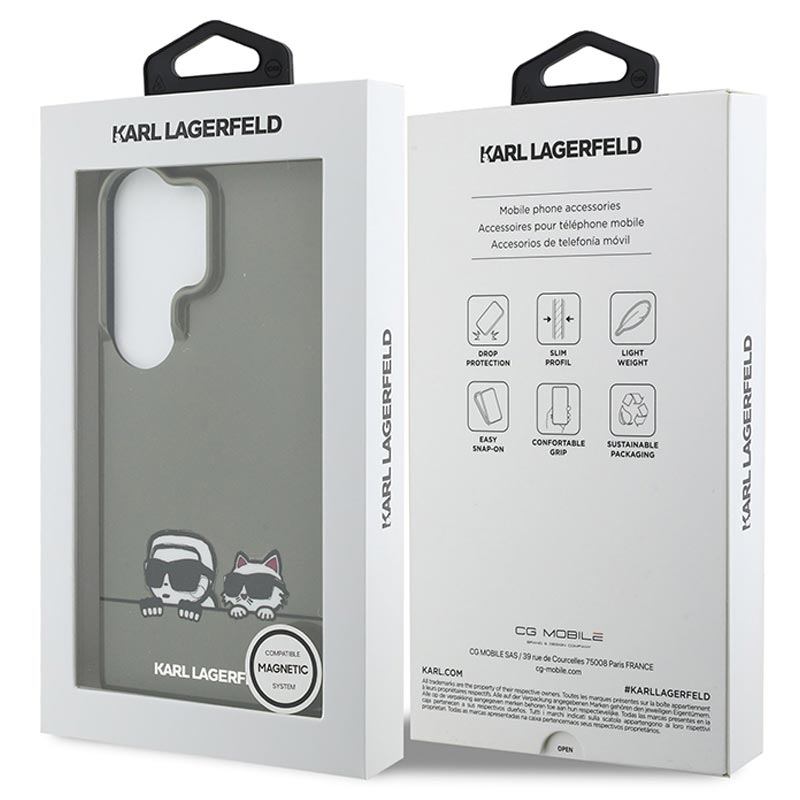 Make a bold fashion statement with the Karl Lagerfeld IML Karl and Choupette Peekaboo Logo magnetic case for Samsung Galaxy S26 Ultra. This premium hybrid back cover blends iconic designer style with everyday practicality. Featuring the Peekaboo logo motif of Karl Lagerfeld and his cat Choupette, it transforms your phone into a stylish accessory while providing reliable protection in a slim, lightweight form.
