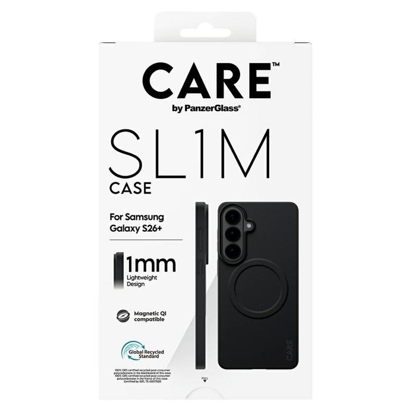 Meet the case that protects without hiding your Samsung Galaxy S26+. The CARE by PanzerGlass SL1M MagSafe Case for Samsung Galaxy S26+ is ultra-slim at just 1 mm, so your Samsung Galaxy S26+ keeps its sleek feel and natural look—while gaining everyday protection against drops, shocks, and scratches. It’s fully MagSafe-compatible, making it easy to snap on magnetic chargers and accessories, and it’s made from 100% recycled plastic for a more responsible choice. A special Nanotech coating helps resist sweat, makeup stains, and everyday grime, keeping the case looking clean for longer.