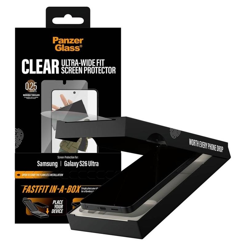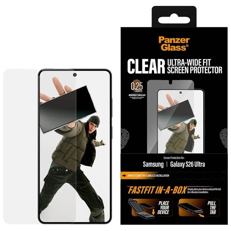 The PanzerGlass Ultra-Wide Fit Screen Protector for Samsung Galaxy S26 Ultra is designed for quick, bubble-free installation thanks to the innovative FASTFIT IN-A-BOX system. Simply place your Samsung Galaxy S26 Ultra face-up, pull the tab, and enjoy a perfectly aligned protector every time - no dust, no frustration.