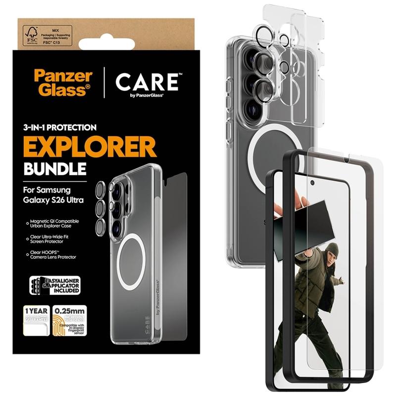 Care by PanzerGlass 3-in-1 Explorer Bundle for Samsung Galaxy S26 Ultra - Screen Protector + Hoops Lens Protector + Urban Combat Magnetic Case, EasyAligner