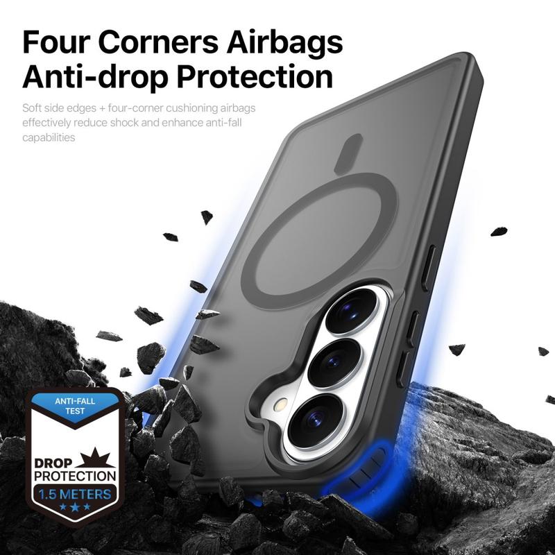 Protect your Samsung Galaxy S26+ with a sleek matte cover that clicks straight onto MagSafe chargers and accessories. The Yind Series pairs a scratch-resistant PC backplate with shock-absorbing TPU edges and a precision-aligned magnetic ring, delivering cable-free power and all-round drop protection without bulky pockets.