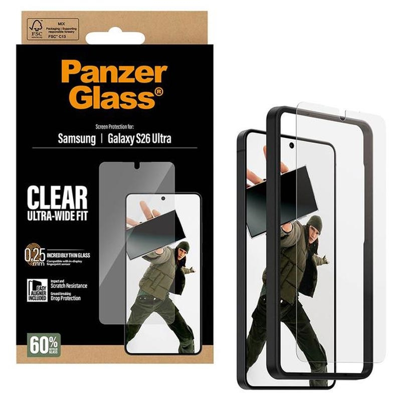 - Ultra-Wide Fit tempered glass screen protector for Samsung Galaxy S26 Ultra by PanzerGlass