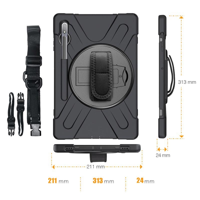 This rugged hybrid case protects your Samsung Galaxy Tab S7+, Galaxy Tab S8+ from daily damage, as well as shocks and drops. The integrated 360-degrees swivel kickstand allows for comfortable use in both portrait and landscape orientation. Also, the case comes with a shoulder strap and a hand strap, so you can safely carry your Samsung Galaxy Tab S7+, Galaxy Tab S8+.