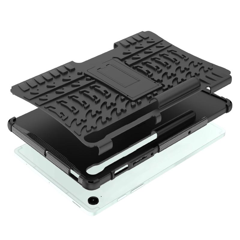 The hard outer layer makes your Samsung Galaxy Tab S10 FE, Galaxy Tab S9 FE less susceptible to bending, while the shock-absorbing inner layer protects it from drops and impacts. Upon that, the built-in kickstand enables comfortable video watching on your Samsung Galaxy Tab S10 FE, Galaxy Tab S9 FE.