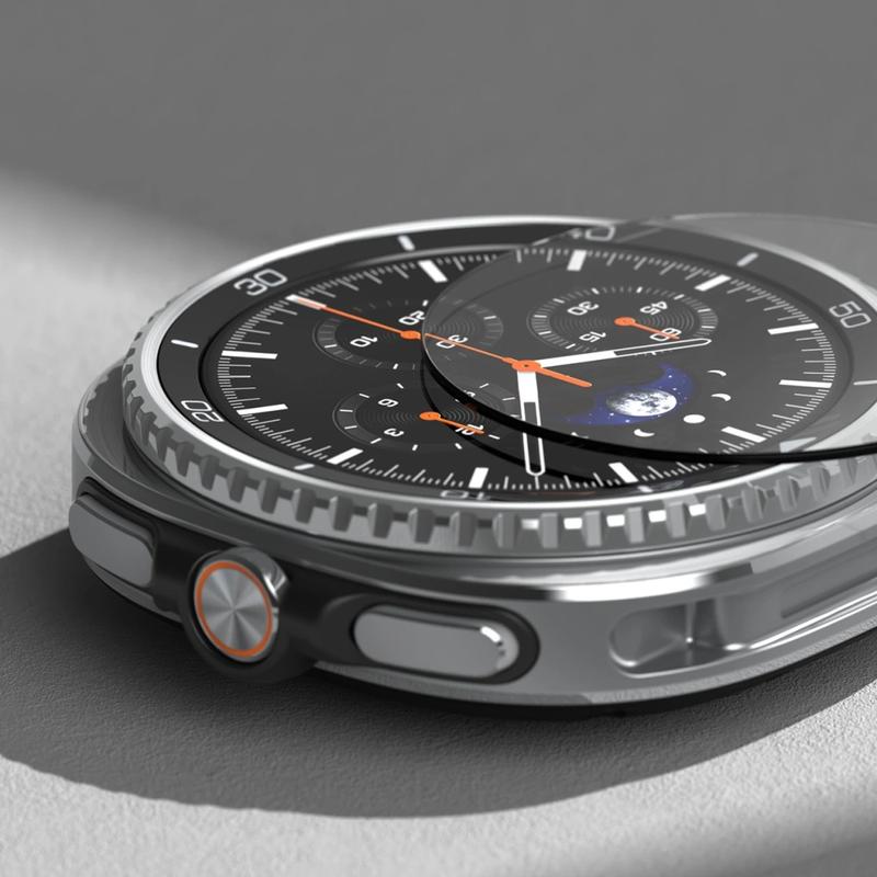 The Ringke Easy Slide tempered glass provides the perfect solution for protecting your Samsung Galaxy Watch8 Classic screen. Made of processed and reinforced tempered glass, it offers a high degree of hardness (9H) that makes it resistant to scratches, even when in contact with sharp objects like knives or keys. The special oleophobic coating minimizes the appearance of fingerprints and other contaminants, keeping the glass surface clean and clear. Easy Slide is designed to protect the screen against scratches and impacts resulting from unexpected falls. The set includes an Easy Slide installation tool for easy and precise application. With the widest possible Case Friendly die cut, it is compatible with most cases on the market and with every Ringke case.