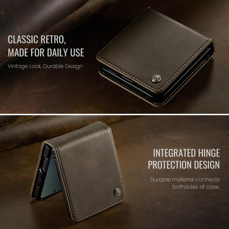 The CASEME 033 Series Wallet Case for Samsung Galaxy Z Flip7 is crafted from calf texture polyurethane combined with TPU, offering full-body protection against scratches, impacts, and daily wear while maintaining a premium, elegant look.