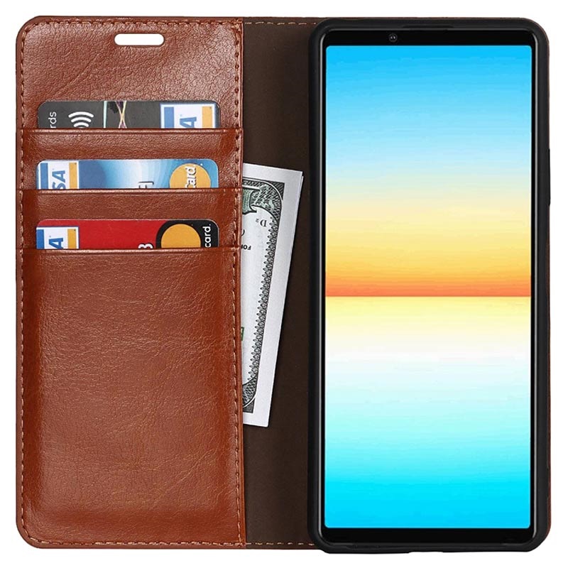 A high-quality sophisticated leather case for your Sony Xperia 10 IV. Give your phone a premium look, while keeping it safe from scratches and common damage. This multifunctional soft leather wallet case has inner pockets for cards and one larger pocket for cash. On top of that Sony Xperia 10 IV genuine leather case has hands-free viewing stand and front cutout for talking with case closed.