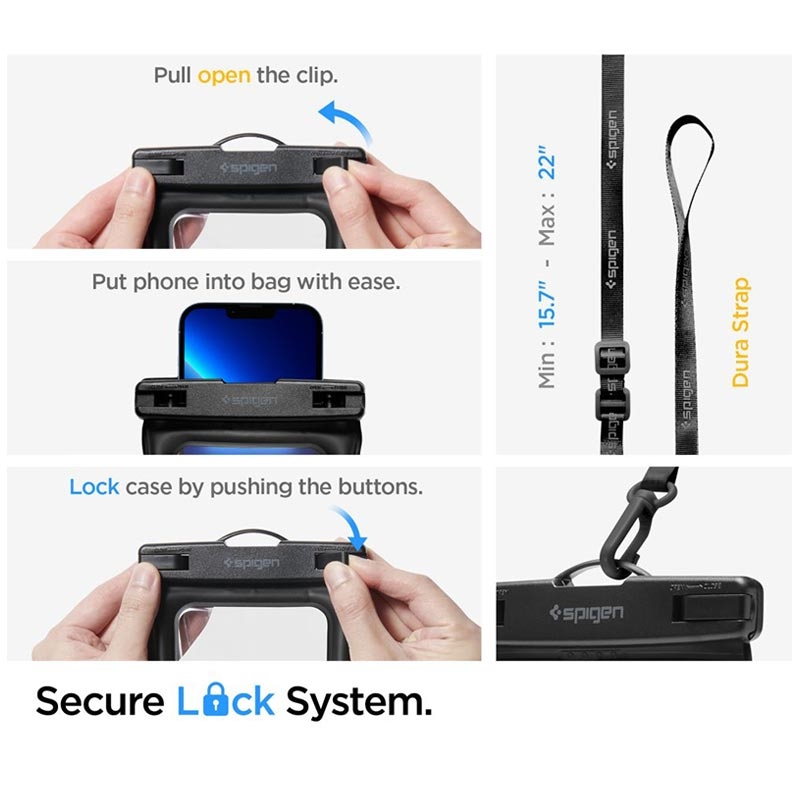 - Secure lock system protects your phone and essentials from water, dust, and moisture