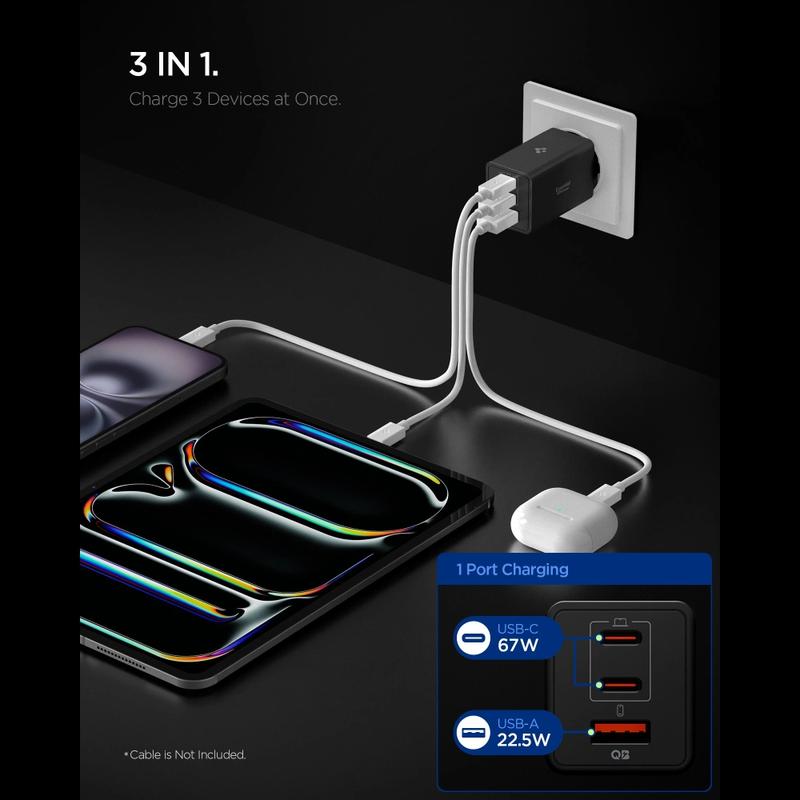 - 3-port fast charging with two USB-C ports (up to 67W) and one USB-A port (22.5W)