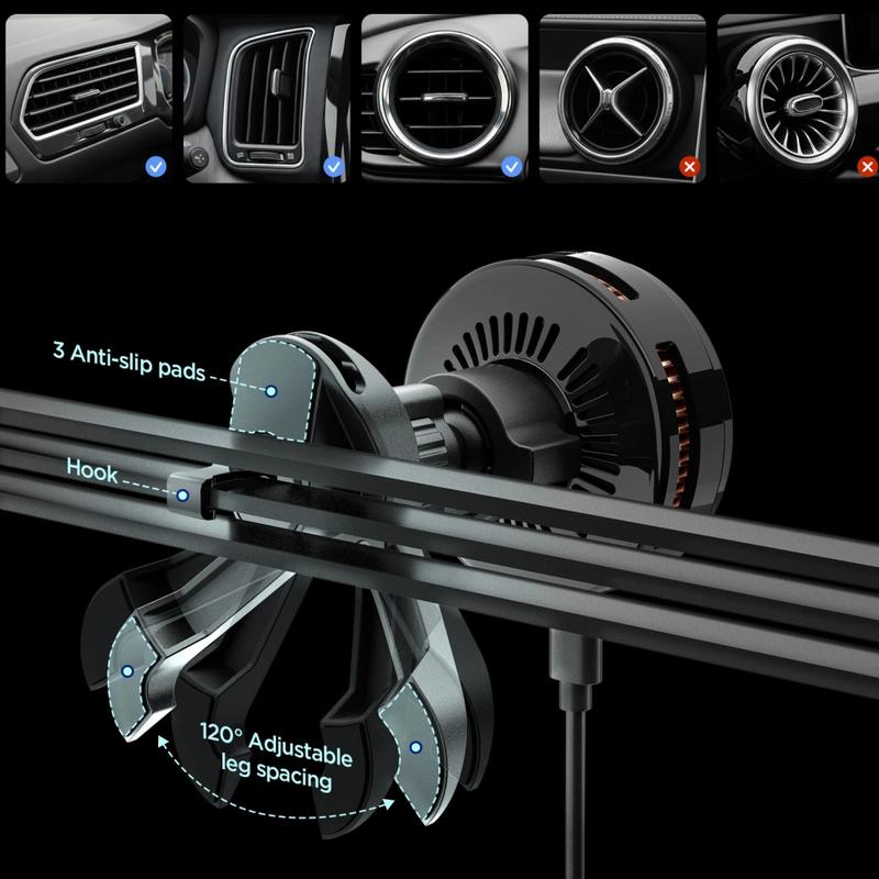 • Spigen Essential EV25MFAQ Qi2.2 Peltier Magnetic MagSafe Air Vent Car Holder / 25W Wireless Charger with Active Cooling