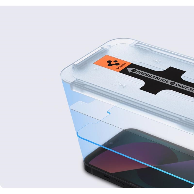The Spigen Glas.tR Ez Fit screen protector for iPhone 13, iPhone 13 Pro, iPhone 14, iPhone 16e comes with an innovative tray designed to achieve perfect alignment and easy installation. This screen protector is made of premium 9H tempered glass that provides excellent protection against scratches and impacts, with an oleophobic coating to maintain the screen of your iPhone 13, iPhone 13 Pro, iPhone 14, iPhone 16e smudge-free.