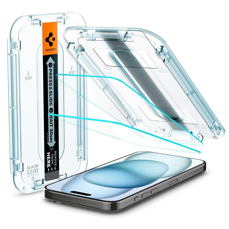 The Spigen Glas.tR Ez Fit screen protector for iPhone 15, iPhone 16 comes with an innovative tray designed to achieve perfect alignment and easy installation. This screen protector is made of premium 9H tempered glass that provides excellent protection against scratches and impacts, with an oleophobic coating to maintain the screen of your iPhone 15, iPhone 16 smudge-free.