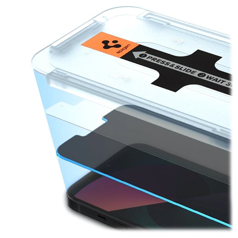 The newest Spigen Glas.tR Ez Fit Privacy screen protector for iPhone 13, iPhone 13 Pro, iPhone 14, iPhone 16e comes with an innovative tray designed to achieve perfect alignment and easy installation. The screen protector is made of premium 9H tempered glass that provides excellent protection against scratches and impacts. Meanwhile, thanks to a special privacy filter you do not have to worry about someone looking over your shoulder when you use your iPhone 13, iPhone 13 Pro, iPhone 14, iPhone 16e.