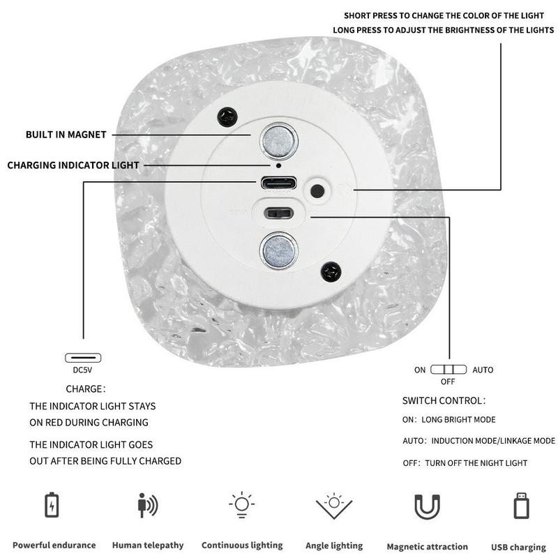 • Square Motion Sensor LED Night Light - Magnetic Rechargeable Wall Lamp with 3 Color Temperatures, 360 Rotating Ambient Light