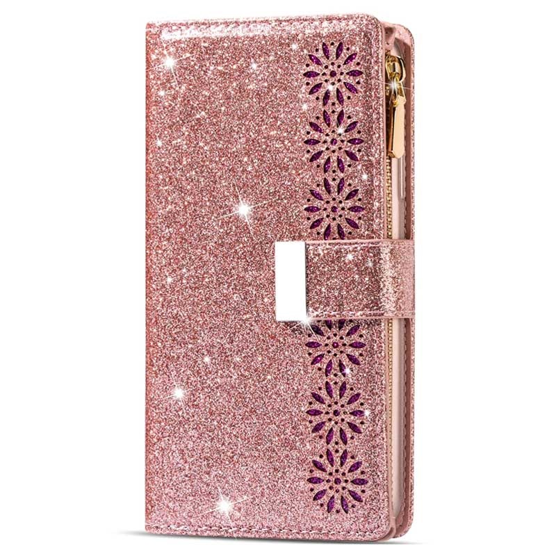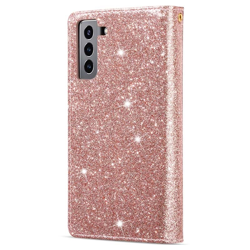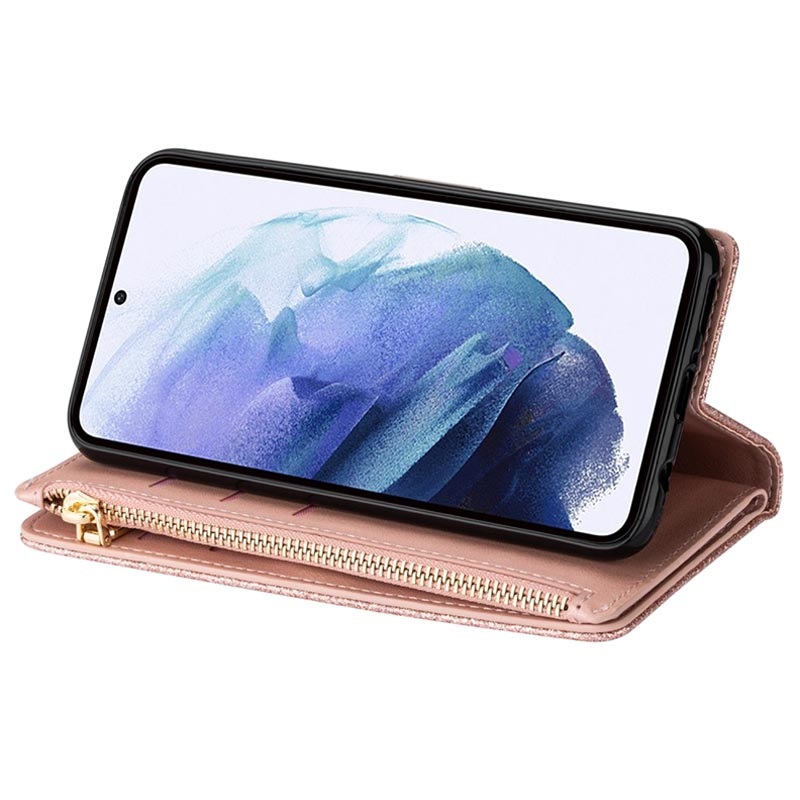 The most elegant way to carry your Samsung Galaxy S22 5G is shielded with this sparkling wallet case. It provides excellent all-around protection, while the strong magnetic closure keeps all your valuables and your Samsung Galaxy S22 5G secured. The case features multiple card slots and a large zipper pocket, while the foldable back doubles as a stand for convenient media watching. This stylish wallet case for Samsung Galaxy S22 5G comes with a handy lanyard for extra safety in crowded places.