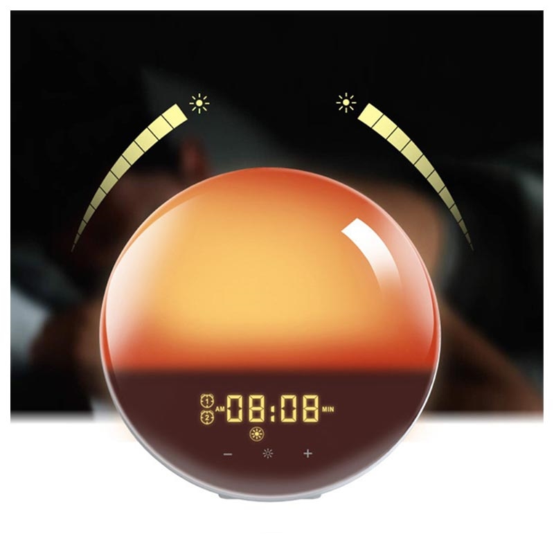 Sleep-aid function: simulated sunset light to help sleep; music to help sleep, built-in 8 kinds of white noise natural music, you can also choose FM radio audio channel as sleep music