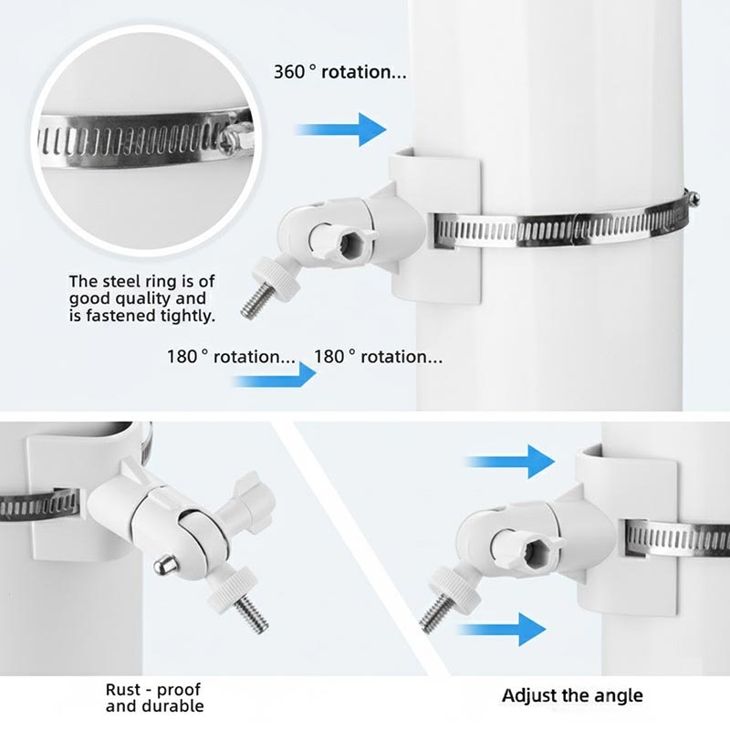 The clamp design allows mounting on drain pipes, railings, poles, tree trunks and other cylindrical objects, offering flexible installation options for homes, gardens, warehouses and outdoor areas.