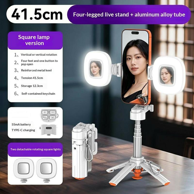 Its auto-open tripod legs provide quick stability when placed down, while the extendable design and rotating phone holder make it easy to switch between different shooting angles and formats. The included Bluetooth remote helps you take photos hands-free, and the dual square fill lights add extra brightness for selfies, video calls, and recordings.