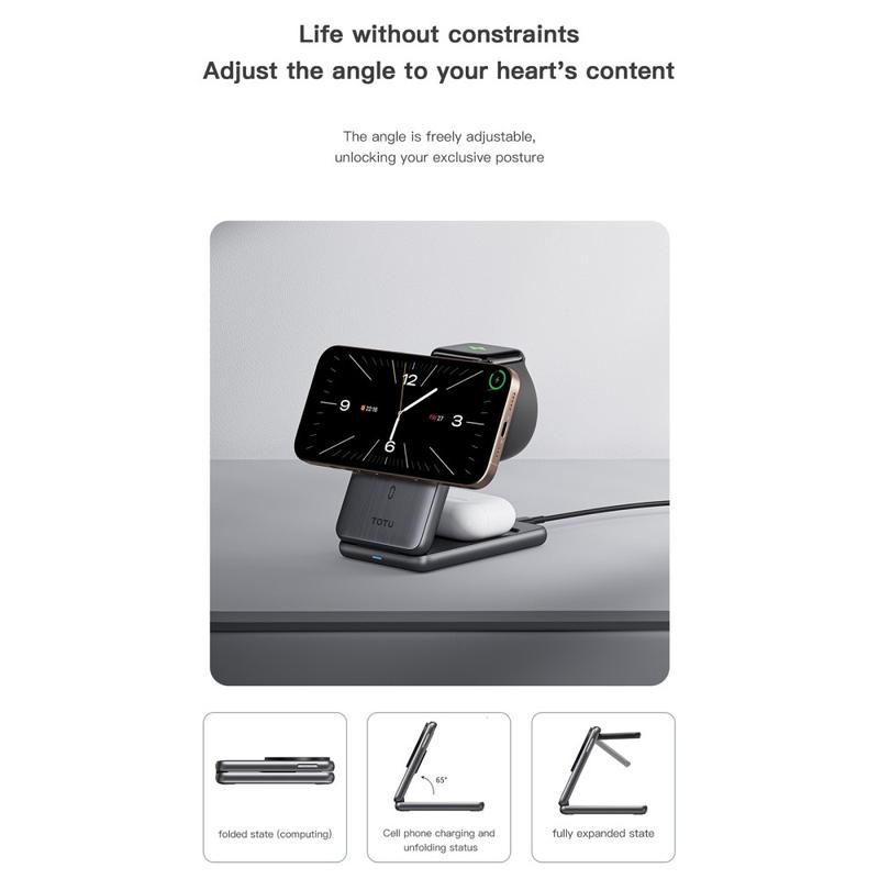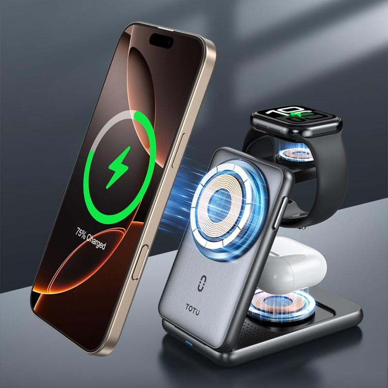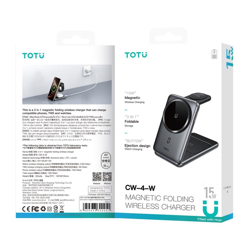 Totu CW-4-W 3-in-1 Wireless Charging Station - Magnetic Folding Charger Stand for Phone, Watch & Earbuds - 15W Fast Charge