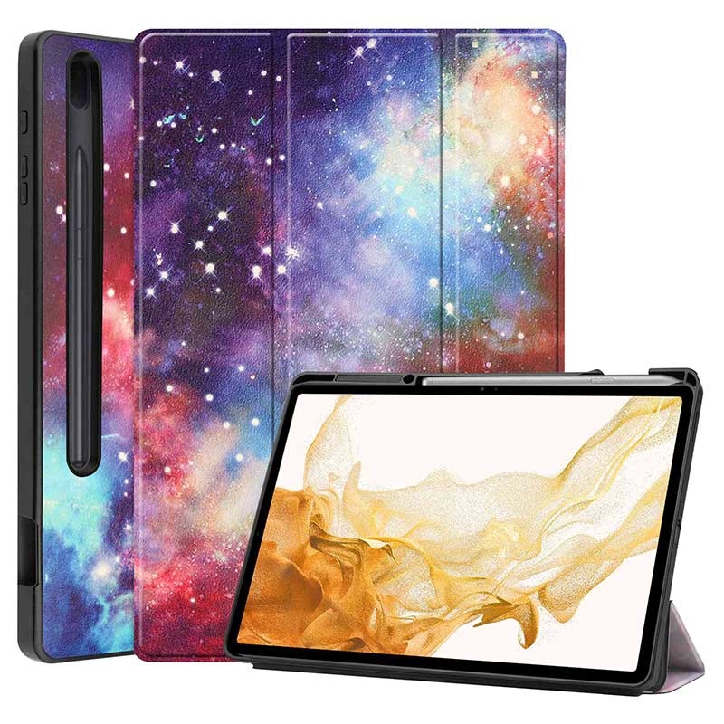 Have an exquisite look and great feel in your hand with your new tri-fold folio case for Samsung Galaxy Tab S7+, Galaxy Tab S8+. Slim and lightweight folio case allow you hassle-free operation and full-screen display. Four corners protect your Samsung Galaxy Tab S7+, Galaxy Tab S8+ from scratching and falls.
