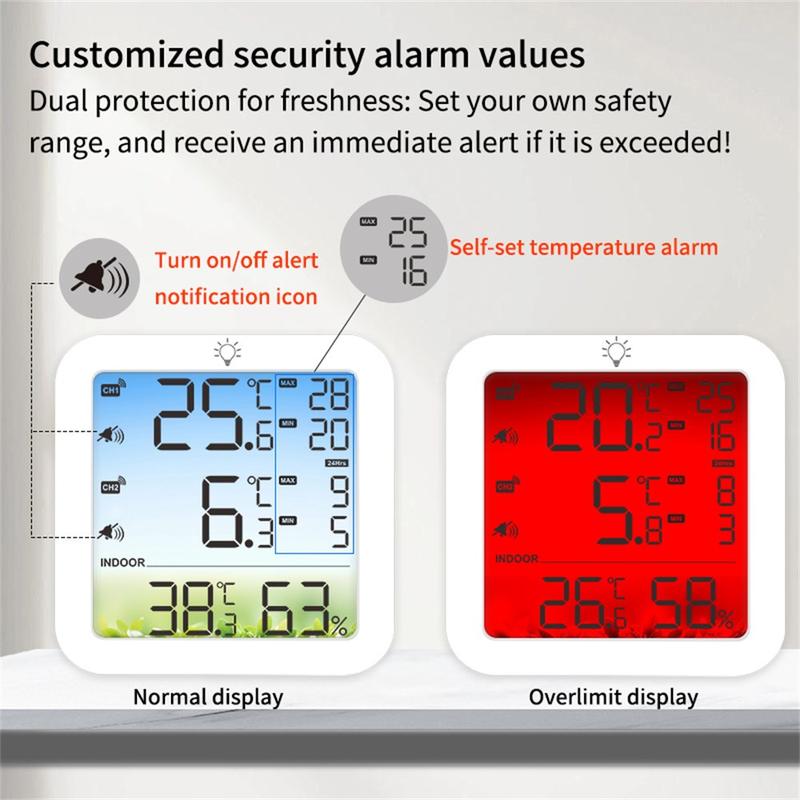 • TS-8082 Dual Channel Wireless Thermometer Hygrometer - Fridge and Freezer Temperature Monitor with 2 Sensors and Alarm