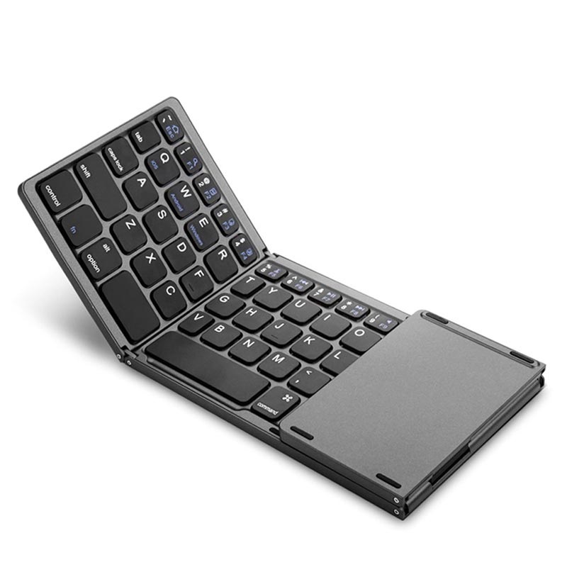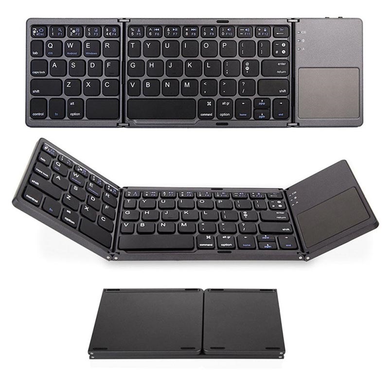 Small and thin, this universal Bluetooth keyboard with touchpad can always be with you. Its foldable design makes it very compact and easy to carry anywhere. Bluetooth technology means you don't have to occupy valuable USB ports with wireless receivers. The configuration is easy, and no installation or drivers are required. This ultra-thin double-fold keyboard easily adapts to your bag, and the keys are kept secure inside the durable double-fold construction.