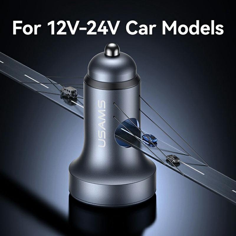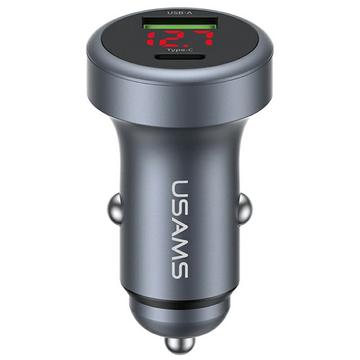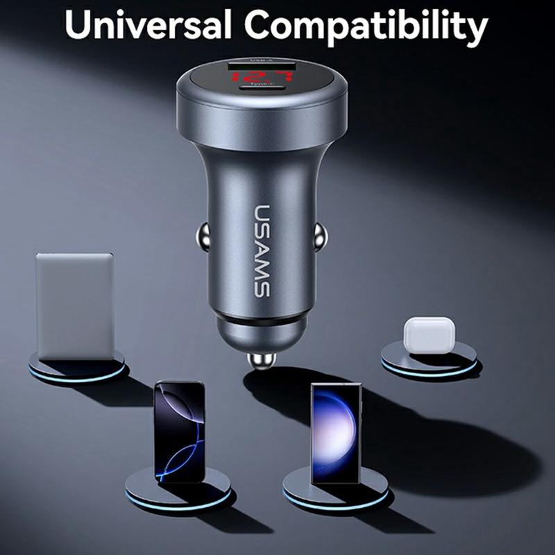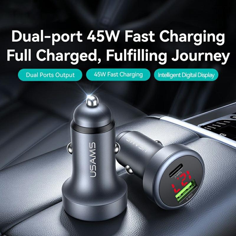 Usams CC327 C44 Dual-Port Car Charger - 45W Fast Charging Aluminum Adapter with Voltage Display