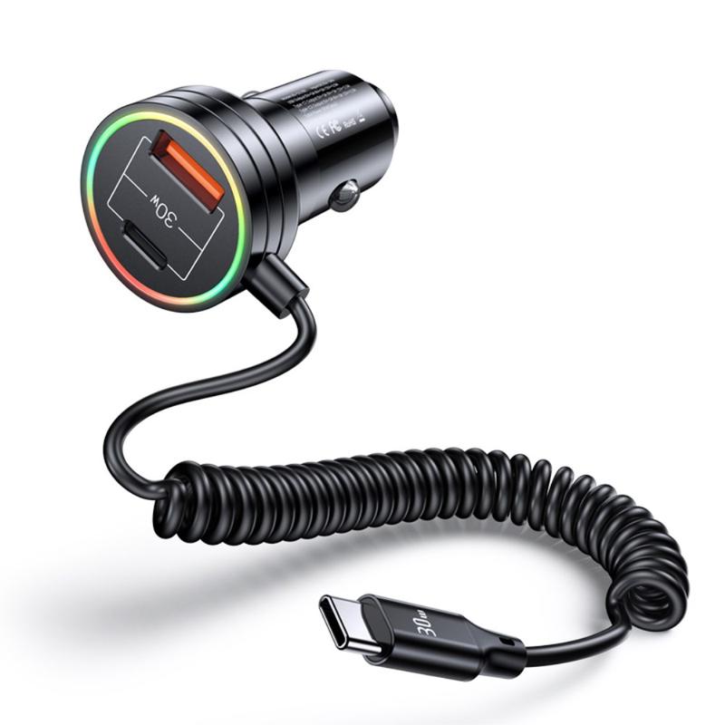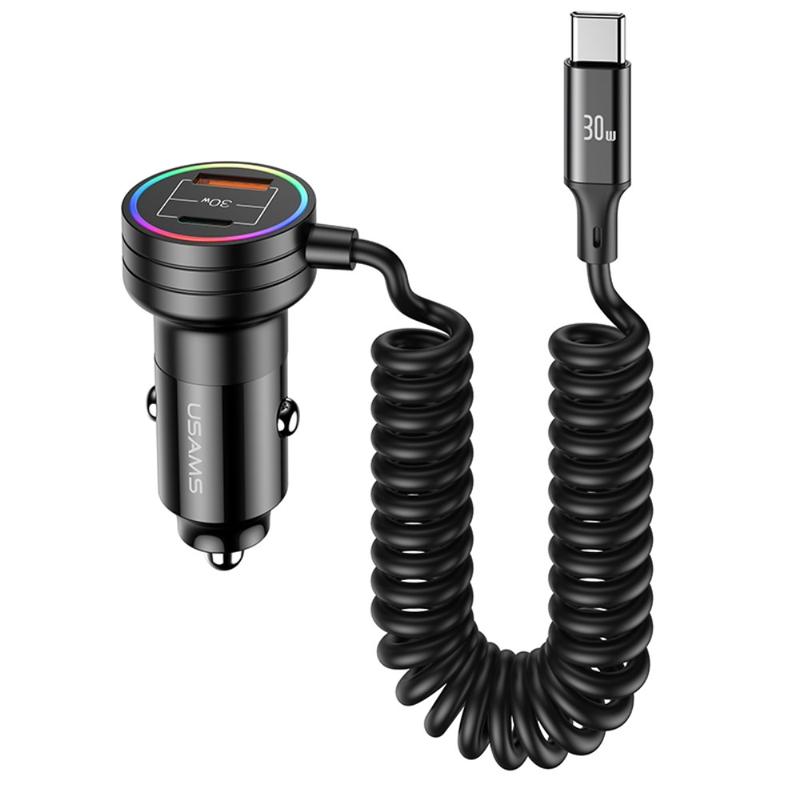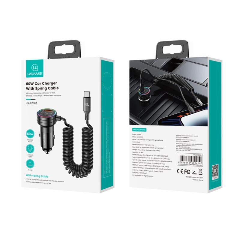 Usams US-CC167 Car Charger 60W With USB-C, USB-A Ports and USB-C Cable - Ambient Light, Power Delivery