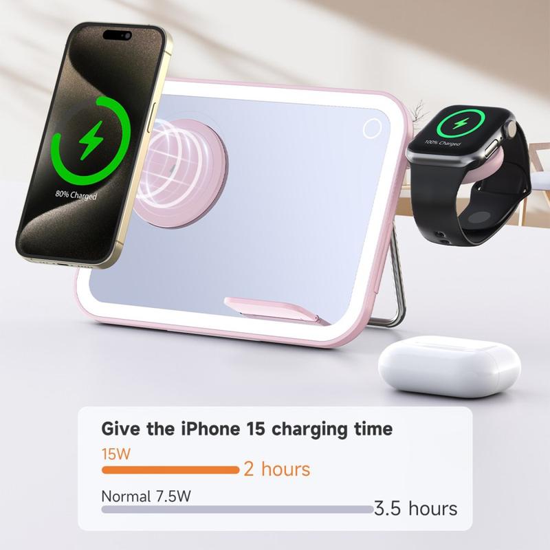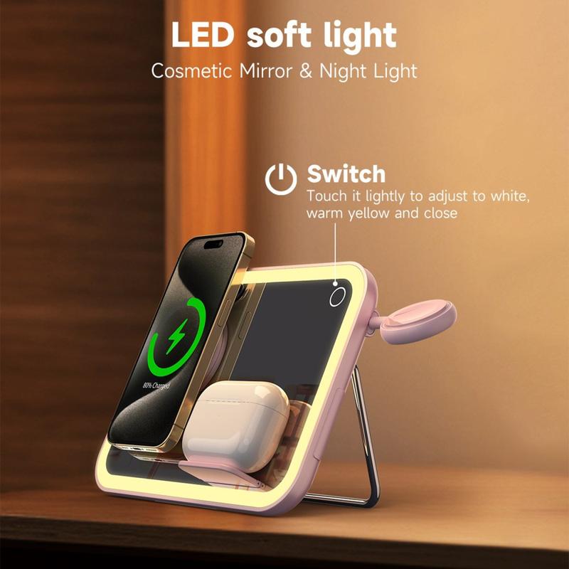 The V22 3-in-1 Wireless Charger combines a MagSafe-compatible charger, an LED makeup mirror, and a night light in one elegant device. This versatile gadget is designed to provide convenience and functionality in your daily routine.