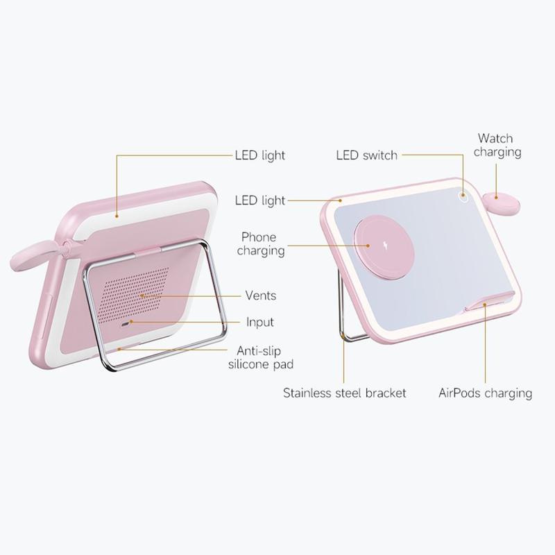 V22 3-in-1 MagSafe Wireless Charger w. LED Makeup Mirror, Night Light - Pink