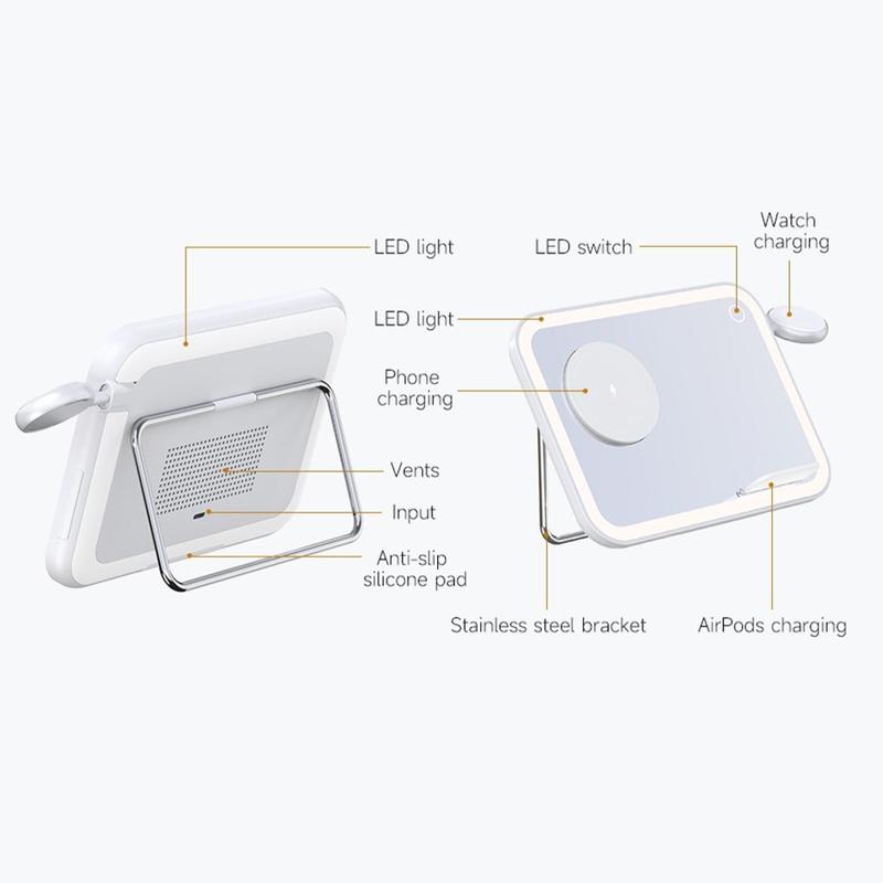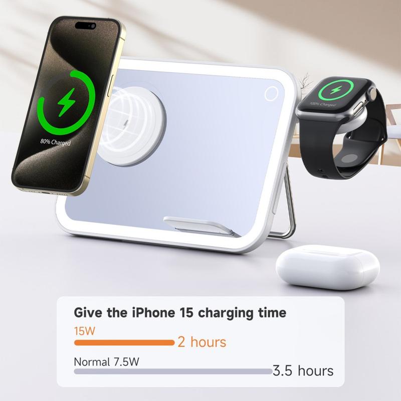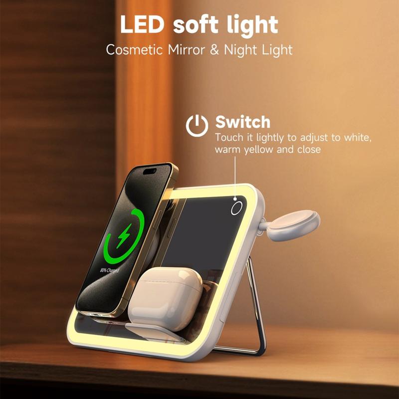 V22 3-in-1 MagSafe Wireless Charger with LED Makeup Mirror, Night Light - 10W/5W/3W