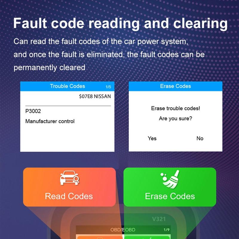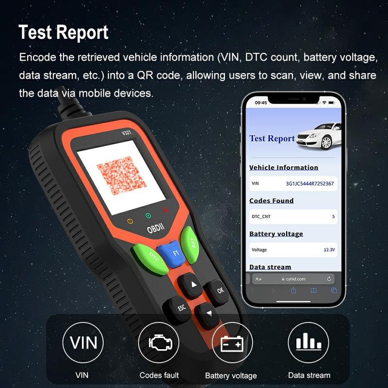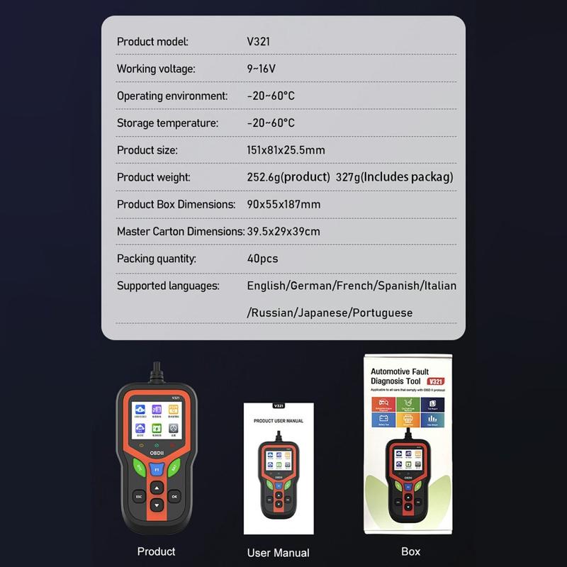 Plug in, power up and diagnose in minutes. The V321 handheld OBD2 scanner connects to your vehicle’s diagnostic port and presents clear fault codes, live parameters and battery health on a bright 2.4″ colour display (320 × 240). With support for all core OBD II/EOBD protocols and a simple plug-and-play workflow, it’s an ideal glovebox tool for quick checks before a trip or after a repair.