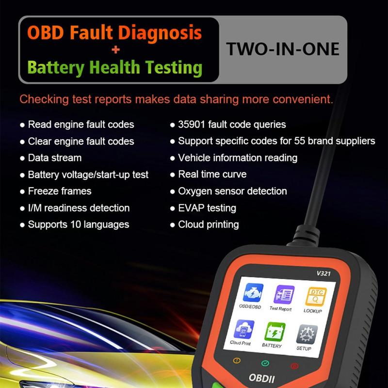 V321 OBD2 Car Diagnostic Scanner - 2.4″ Colour Screen Engine Code Reader with Battery Health Test, Live Data & Multilingual Menu