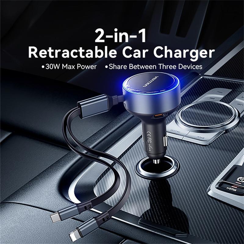 Vention FFOB0 PD 30W Fast Charging Car Charger with Built-In USB-C and Lightning Cables