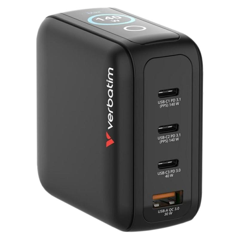Verbatim 4-Port Mini GaN Wall Charger with Display - 140W, EU/UK/US - Black