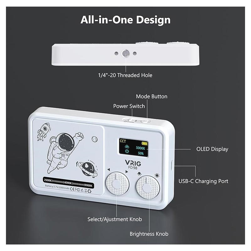 The VRIG FD-98 offers professional lighting quality, full color-temperature control, long battery life and portability in one compact device. It's perfect for creators who want reliable, high-quality illumination without carrying heavy equipment. The combination of CRI 95+, an OLED display and stepless controls gives you creative flexibility usually found in much larger lights.