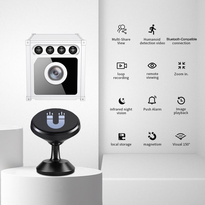 - Compact indoor WiFi security camera with magnetic bracket for flexible placement