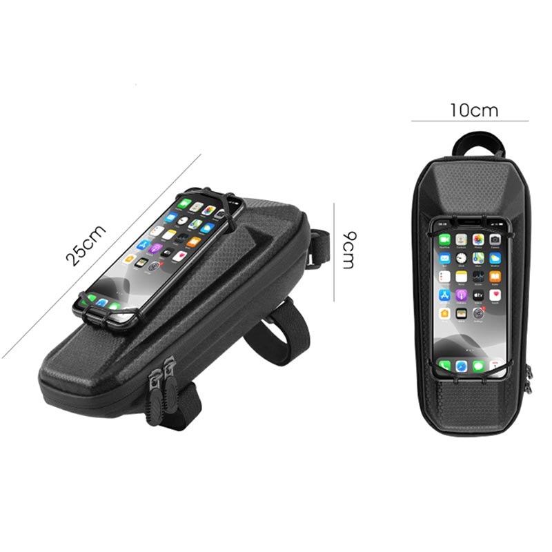 Compact shell made from water-resistant EVA material will keep your essentials safe while you navigate through bicycle apps, thanks to a silicone phone holder placed on top of the casing. A narrow design will reduce the chances of hitting the case while driving. Equipped with Velcro straps, it will fit most bike types. Secure your gear with an inner mesh pouch or fastener tapes, place your smartphone on the 360-degree rotating holder, and you're ready to go!