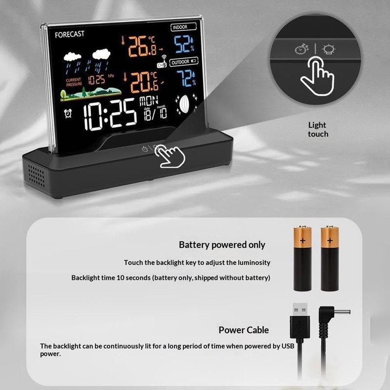 The colour LCD screen shows key information in an easy-to-read format, including temperature, humidity, weather forecast, time, moon phase, and barometric pressure. This makes it simple to check several important details at once without needing separate devices. The backlight helps improve visibility, while USB mode offers 3 brightness settings so you can adjust the display to suit your room and lighting conditions.