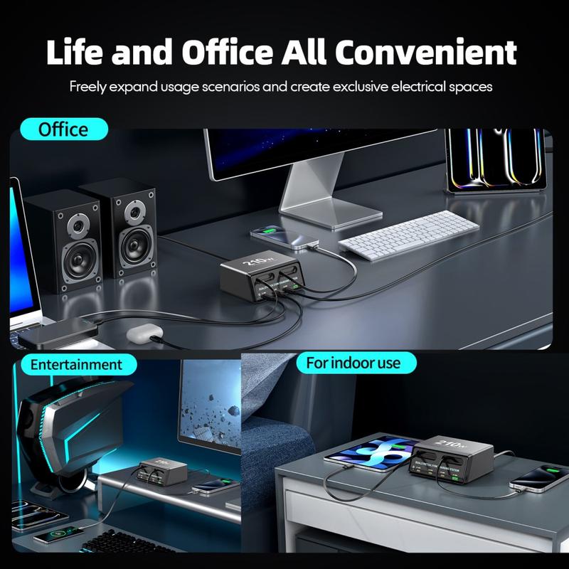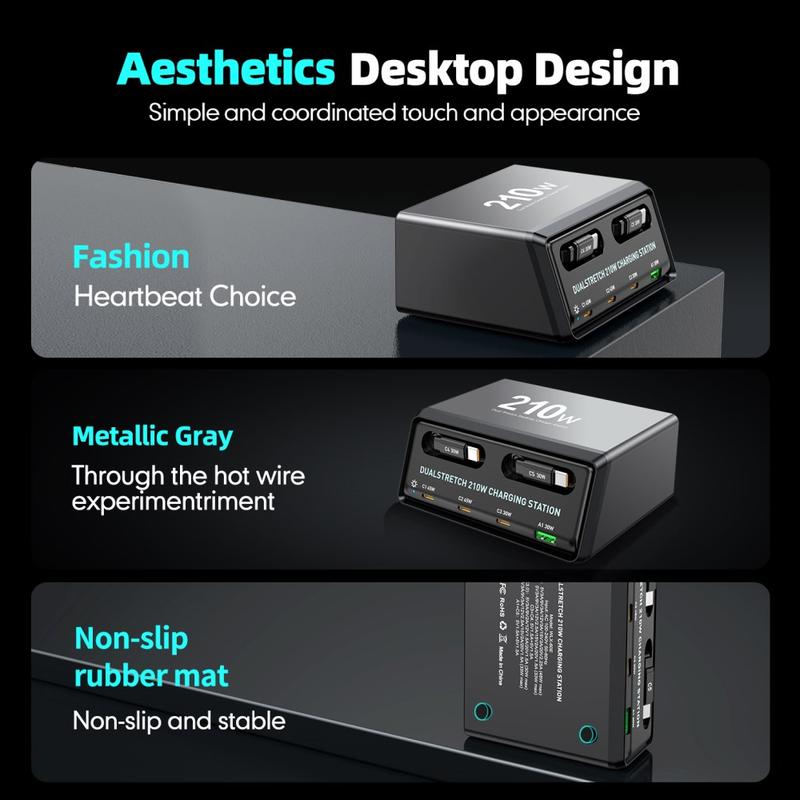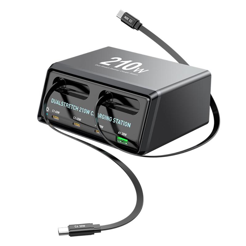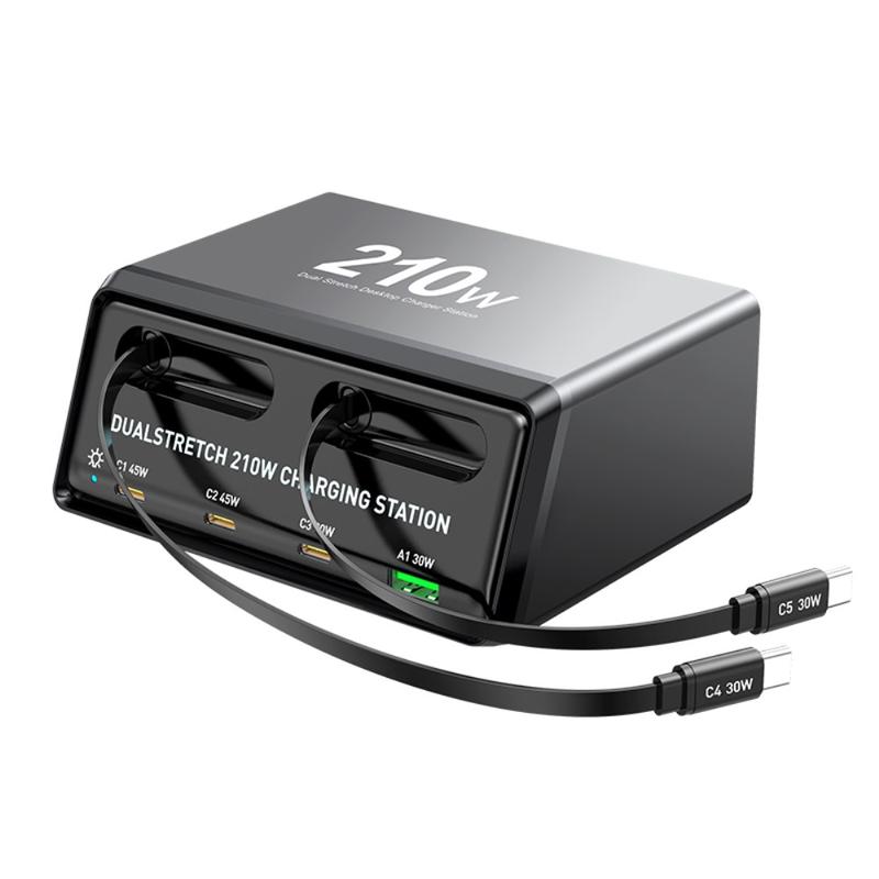 WLX-60E GaN Desktop Charger - 2x Retractable USB-C Cables + 3x USB-C + USB-A, Up to 210W
