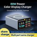 An integrated 5-15W wireless charging pad offers convenient cable-free charging for Qi-enabled smartphones and earbuds. The color display provides real-time charging information for each port, complemented by a physical power switch for quick control.