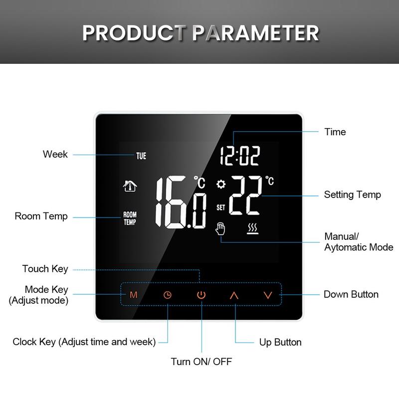 The large LCD touchscreen with backlight is easy to read both day and night. Its elegant one-piece design gives the thermostat a neat and modern look, while the anti-scratch surface helps it stay presentable over time. You can choose between manual mode for direct adjustment and auto mode for programmed heating, depending on your daily routine and personal preferences.