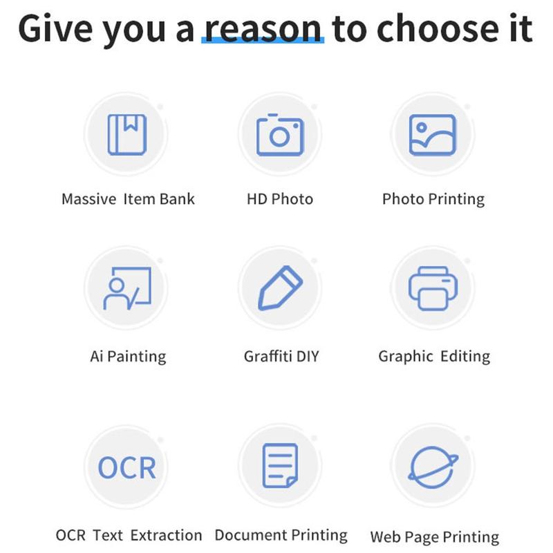 - Supports photo printing, AI painting, OCR text extraction, and more.