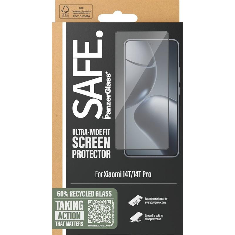 The SAFE. by PanzerGlass Screen Protector for Xiaomi 14T, Xiaomi 14T Pro offers superior protection with 60% recycled glass, safeguarding your device from drops, scratches, and shocks. Its ultra-wide fit ensures full coverage and clear screen visibility, while the fingerprint-resistant coating keeps your screen clean. With 100% touch sensitivity and easy installation using the included , this screen protector blends sustainability and functionality seamlessly.