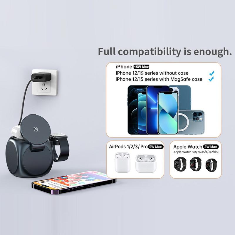 - 3-in-1 Magnetic Charging - Conveniently charge your iPhone, Apple Watch, and AirPods at the same time using one compact and efficient wireless station.